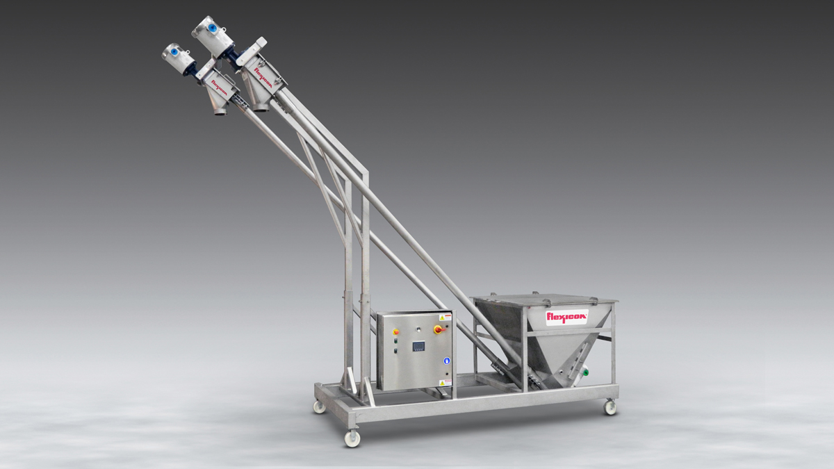 The unit is constructed of 316 stainless steel, and features sanitary quick-release clean out caps, quick-disconnect discharge box access covers, wash-down motors, and a stainless NEMA 4X control panel with stainless conduit and liquid-tight compression fittings that permit wash down during changeovers and/or when conveying of corrosive materials. HMI controls allow manual and automatic start/stop and speed adjustment.