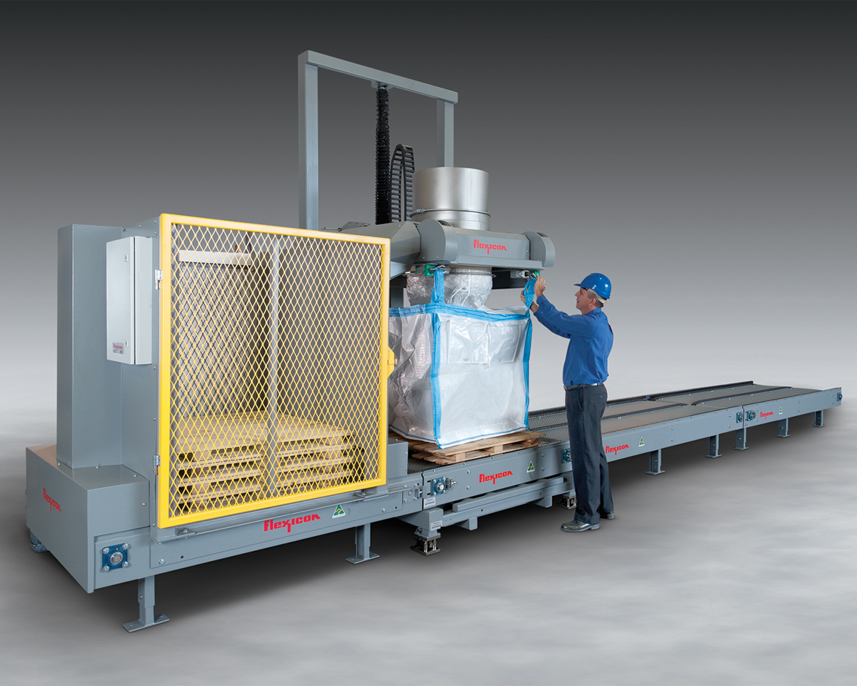 The system integrates a SWING-DOWN® Bulk Bag Filler with a Flexicon Pallet Dispenser and Powered Chain Conveyor, allowing safe, high-capacity filling of bulk bags of all popular sizes, including bags with wide-diameter spouts for passage of irregular materials.